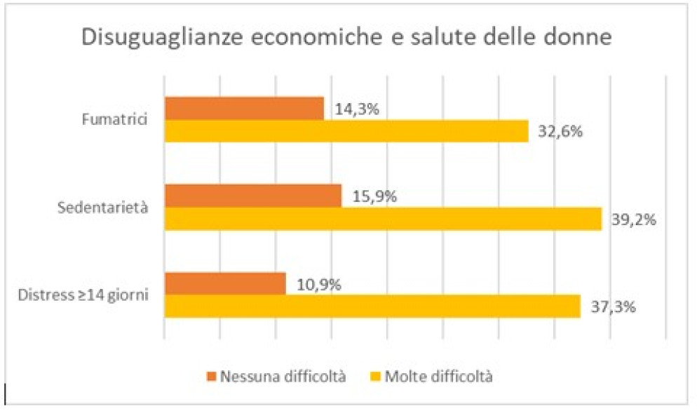 Le disuguaglianze economiche si riflettono anche sui comportamenti e sugli stili di vita. Tra le donne adulte residenti nel territorio, il 14% presenta obesità, il 18% è sedentario e il 22% è fumatrice. Tali percentuali aumentano significativamente in presenza di difficoltà economiche: rispettivamente 21% (obesità), 39% (sedentarietà) e 33% (fumo).