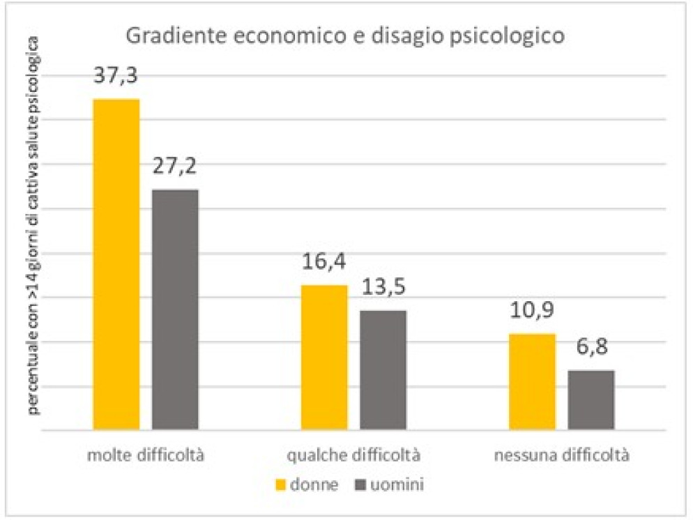 Il legame tra fragilità economica e salute psicologica è particolarmente marcato: tra le donne con gravi difficoltà economiche, oltre una su tre (37%) riferisce almeno due settimane al mese di malessere psicologico, contro circa una su dieci (11%) tra coloro che non presentano problemi di natura economica. Negli uomini, le medesime percentuali si attestano rispettivamente al 27% e al 7%.