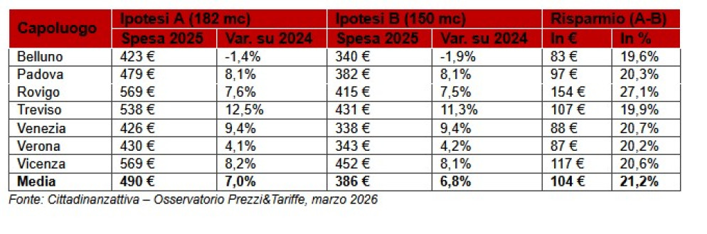 Si attesta a 490 euro la spesa media sostenuta dalle famiglie venete nel 2025 per la bolletta idrica (nell'ipotesi di consumo 182 mc/anno), registrando un aumento del +7,0% rispetto al 2024. A livello nazionale, la spesa media è di 528 euro a famiglia, con un incremento del +5,4% rispetto all'anno precedente.